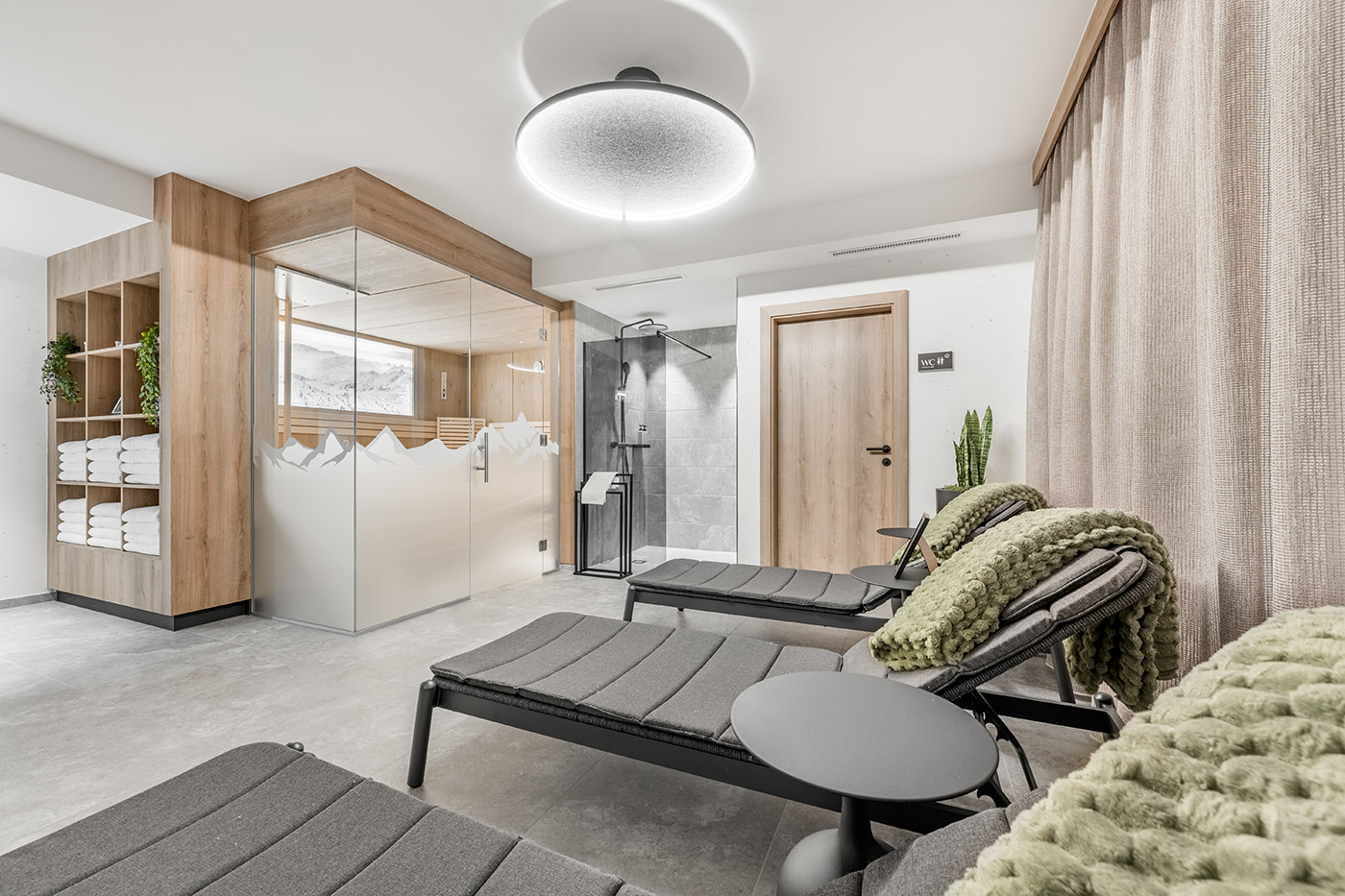 - Die Sauna für 4 bis 6 Personen befindet sich im 2. Untergeschoss und verfügt über Ruheliegen, eine Teebar, eine Dusche und ein WC.