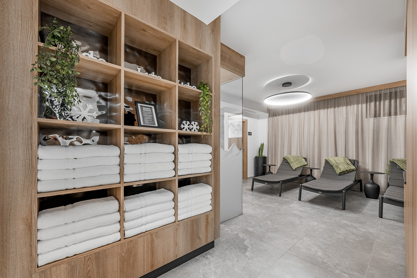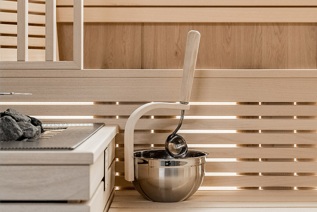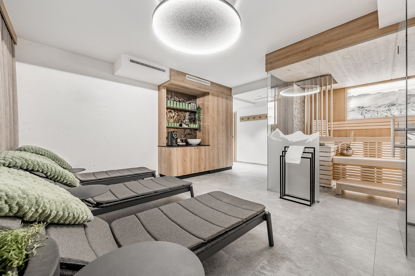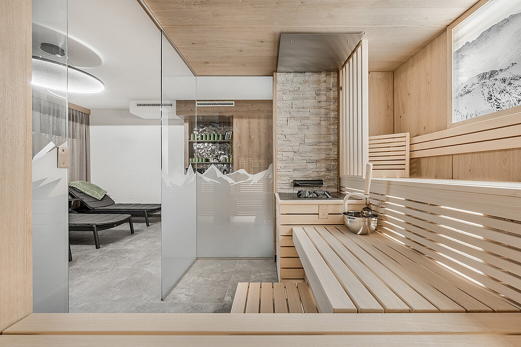 Aufwärmen, durchatmen, entspannen: Die Bergsauna im 2. Untergeschoss bietet Platz für 4 bis 6 Personen – perfekt nach einem Tag im Schnee. Wohltuende Wärme, Ruheliegen und eine Teebar sorgen für pure Erholung. Gegen eine Kaution stehen an der Rezeption Bademäntel, Schlappen und Wellness-Taschen für euch bereit.